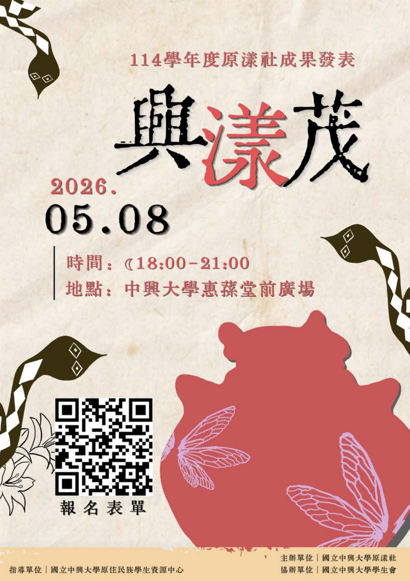(二)由國立中興大學原漾社辦理社團成果發表,活動內容包含以高雄市茂林區魯凱族歌謠為主題之動態演出,以及部落踏查與田野調查成果之靜態展示。