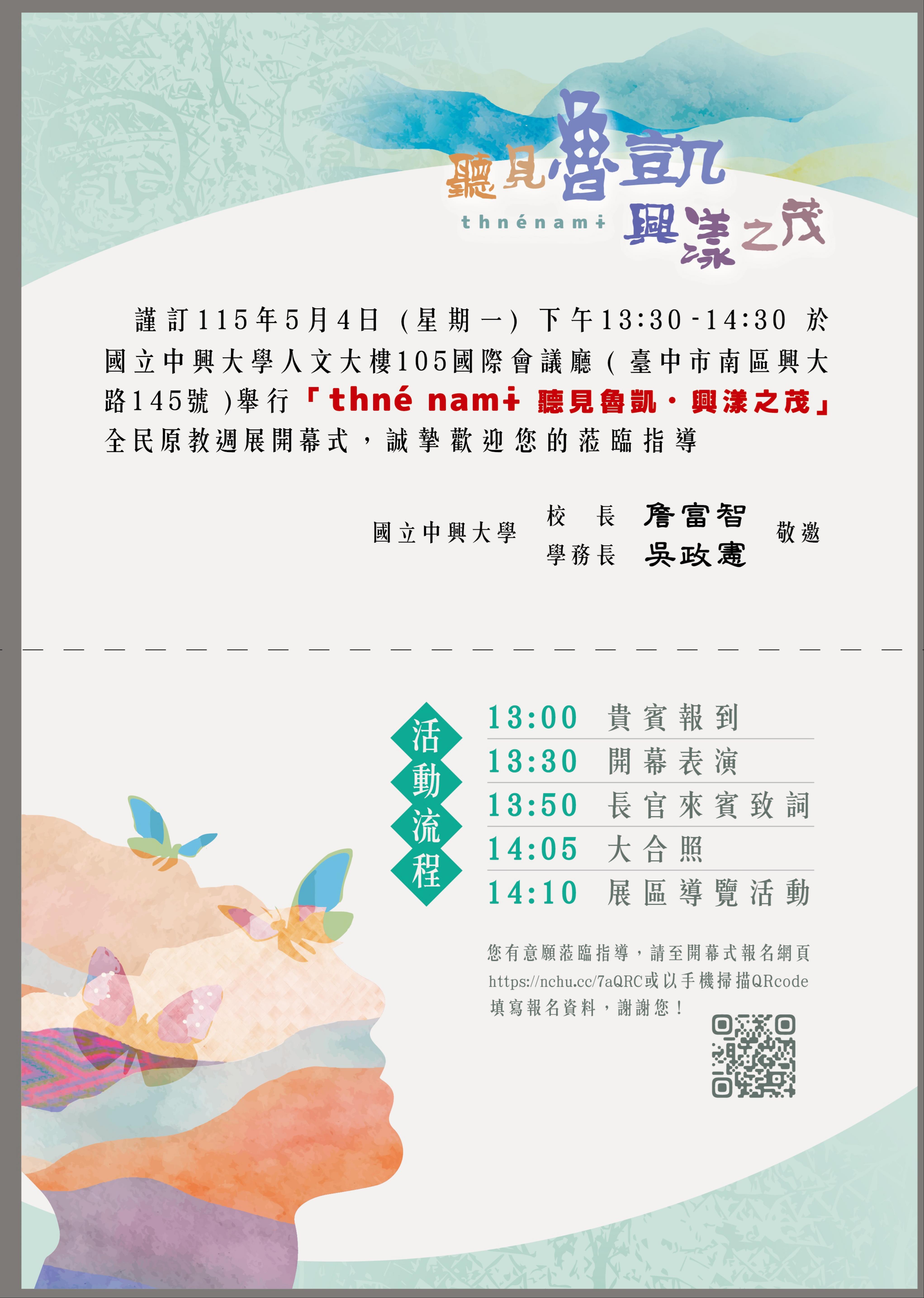 (三)開幕暨展覽地點:國立中興大學人文大樓105國際會議廳及1樓展覽大廳