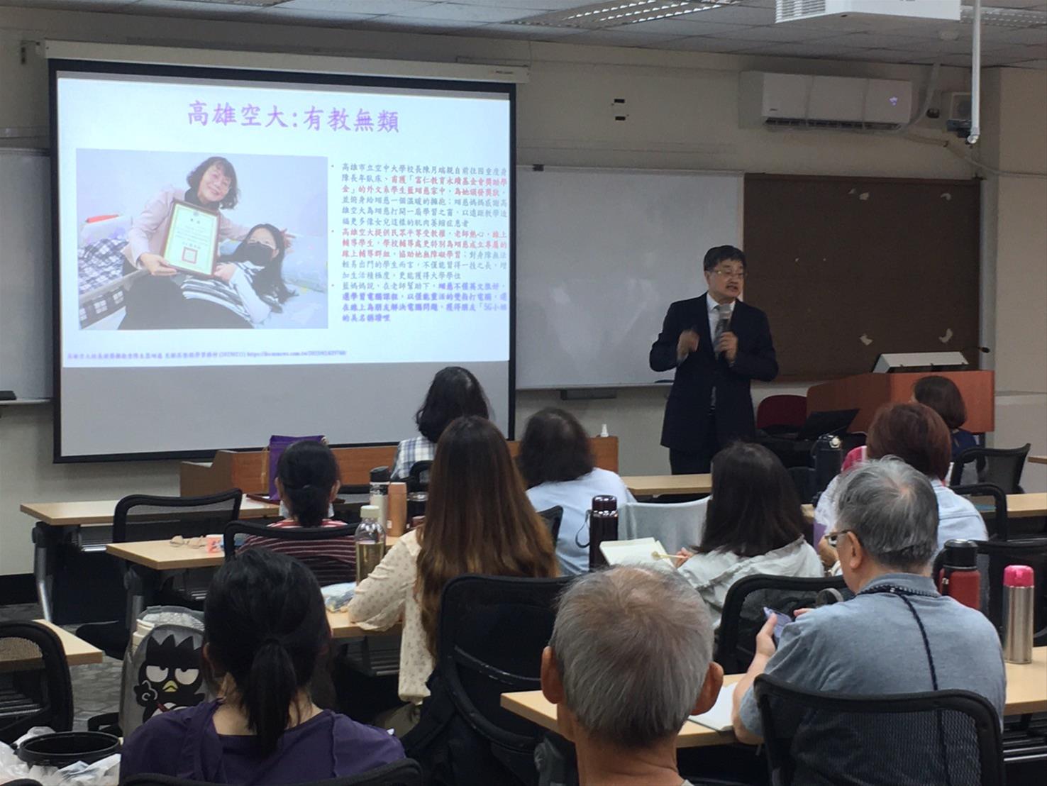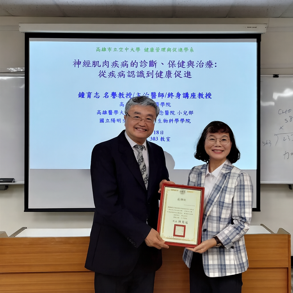 高雄市立空中大學於18日舉辦「神經肌肉疾病的診斷、保健與治療:從疾病認識到健康促進」專題演講,特別邀請前高雄醫學大學校長、現任神經學領域專家鐘育志講座教授主講,鐘講座教授長期投入罕見疾病「脊髓性肌肉萎縮症(Spinal Muscular Atrophy , SMA)」治療與研究,被譽為「台灣SMA之父」。吸引眾多師生熱情參與,現場互動熱絡。