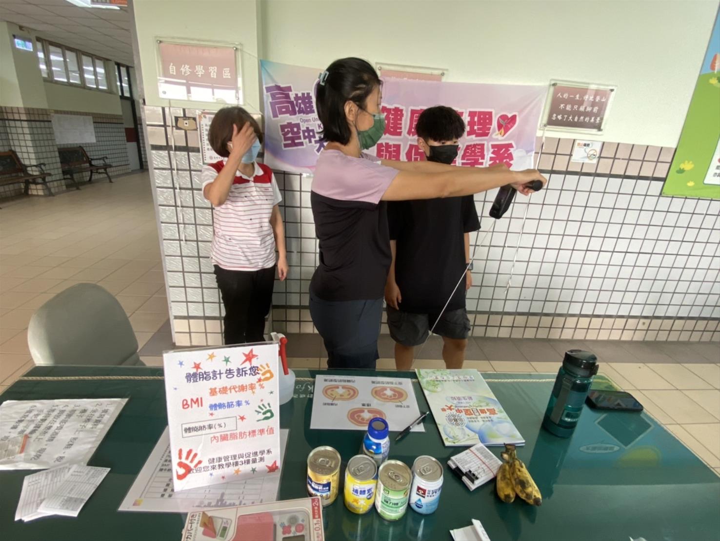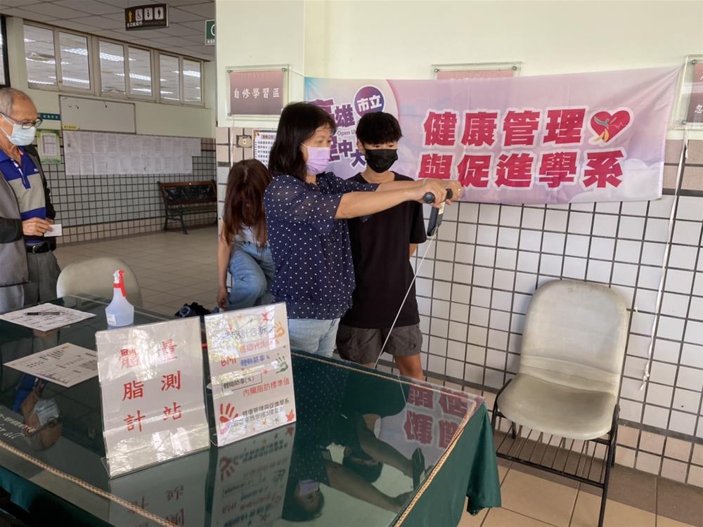 【健管系】113-1學期第1次大面授於教學樓3樓學生休憩區設立體脂計量測服務櫃枱,服務同學,提供健康訊息。