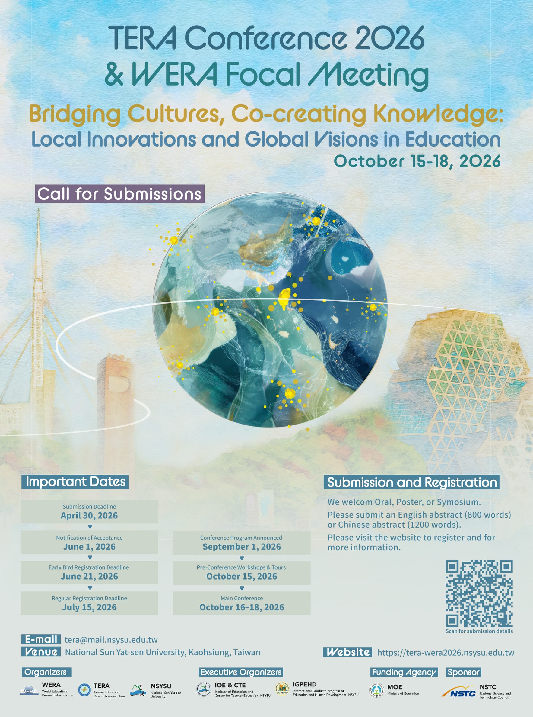 主旨:本校教育研究所、台灣教育研究學會暨世界教育研究學會 謹訂於民國115年10月15日至10月18日舉辦「台灣教育研 究學會暨世界教育研究學會2026國際學術研討會」(TERA Conference 2026 & WERA Focal Meeting),敬請惠予公 告及鼓勵所屬教職員師生踴躍投稿,請查照。