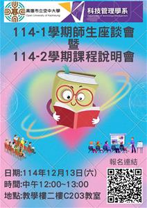 一、同學們,期待已久,114-2學期 科管系的課程說明會來了,我們特別邀請本系專、兼任授課教師介紹新學期課程內容,協助同學深入了解課程架構與學習重點,作為選課參考依據。