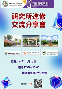 科管系 114-1學期「研究所進修交流分享會」活動 因應同學持續進修的需求,亦期望同學以高空大所學更進一步研讀專業知識,特舉辦「科管系-研究所進修交流分享會」活動,將邀請國立大學三大院校四個系所老師
